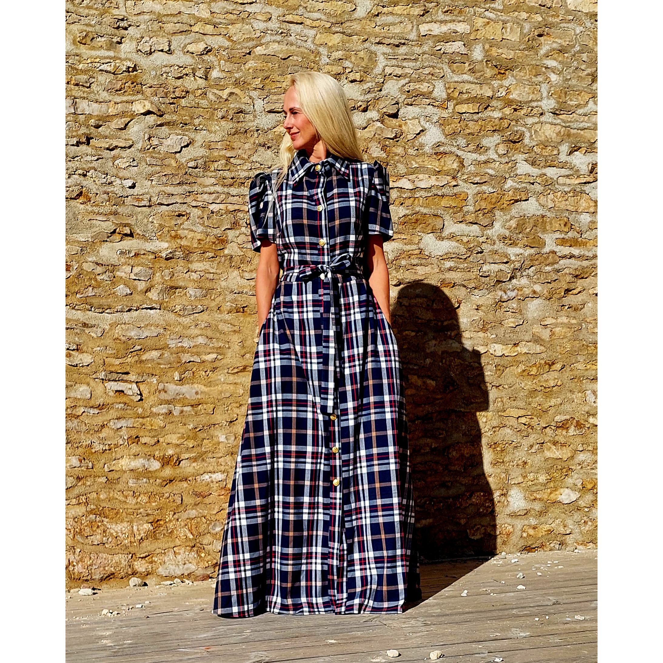 Ruuduline maxikleit on A-lõikelise seelikuosaga, eest liistuga, kuldsete nööpidega ja kraega. Väikesed puhhvid varrukal, taskud ja vöö.